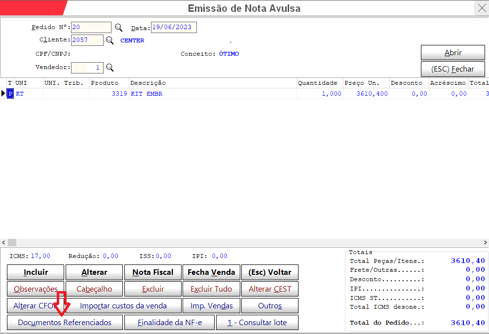 Após o lançamento dos itens teremos que clicar no botão documentos referenciados e colocar a chave da nota que está sendo referenciada.