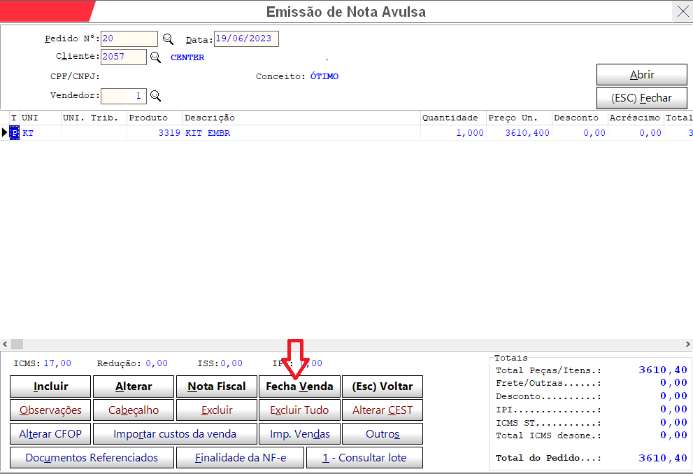 Depois de preencher os campo é só ir apertando ENTER para ir pulando os campos até chegar no OK para finalizar o lançamento do item, se houver mais itens é só repetir o processo. Mas se não houver mais itens para lançar pode clicar em fechar a tela de lançamento de itens.