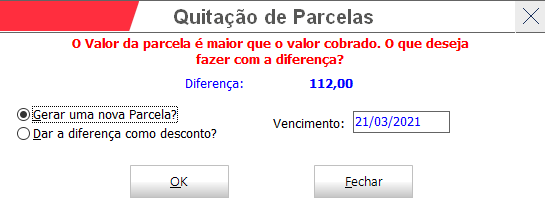 > Nesse momento, ao verificar que o valor informado não é referente ao valor total da parcela, o sistema irá perguntar o que deseja fazer com a diferença: