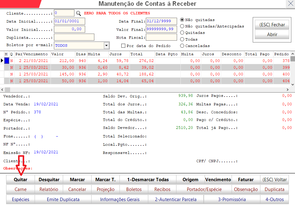 Quando houver a necessidade de quitar uma parcela parcialmente, abra o módulo Contas a Receber (ou atalho F6).