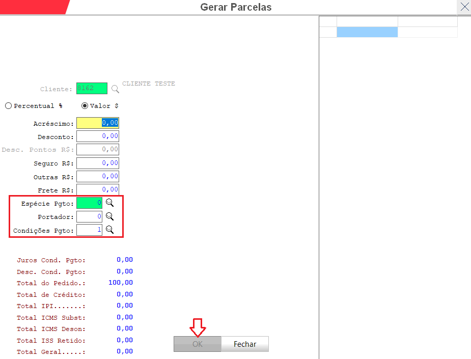 - Informe a Espécie Pgto, Portador e Condições Pgto, clique em OK: