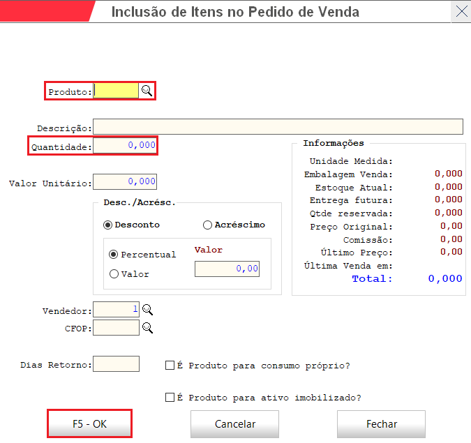 - Informe o Produto e a Quantidade. Caso necessário, as demais informações poderão ser alteradas, inclusive informar Desconto ou Acréscimo no item que está sendo lançado.