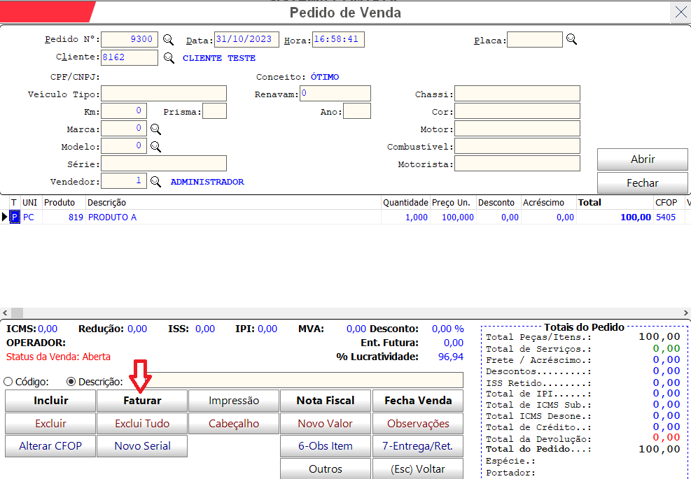- Após todos os lançamento, feche a tela de inclusão de itens e clique em Faturar:
