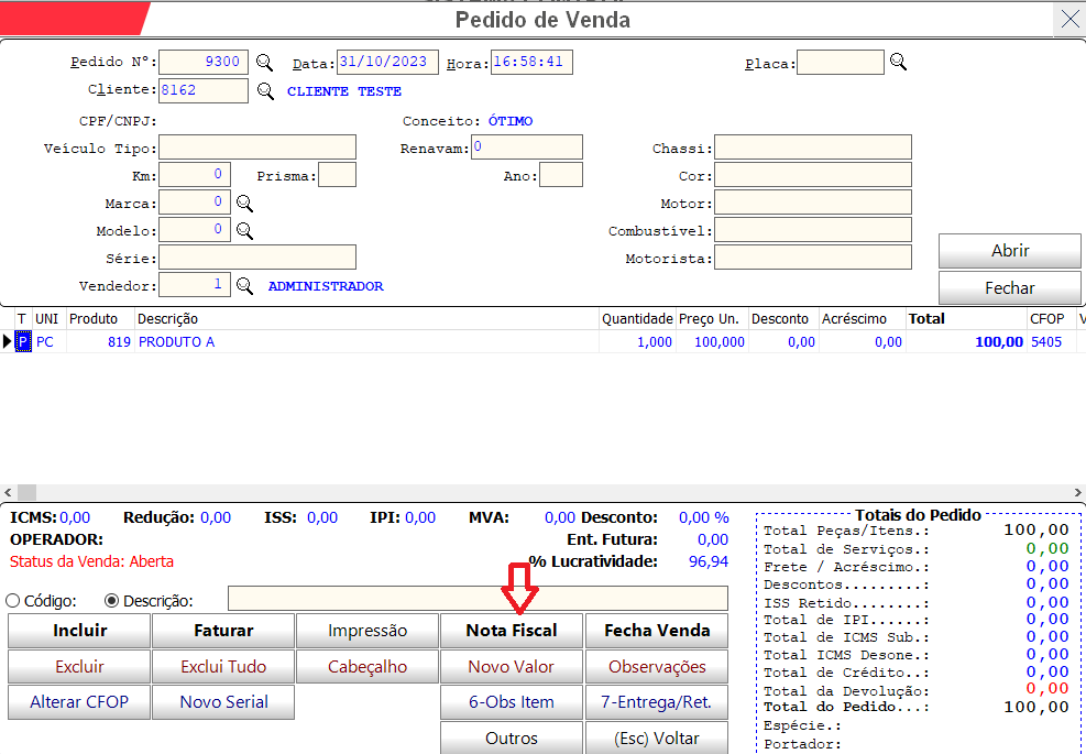 - Na tela de pedido de venda, clique em Nota Fiscal:
