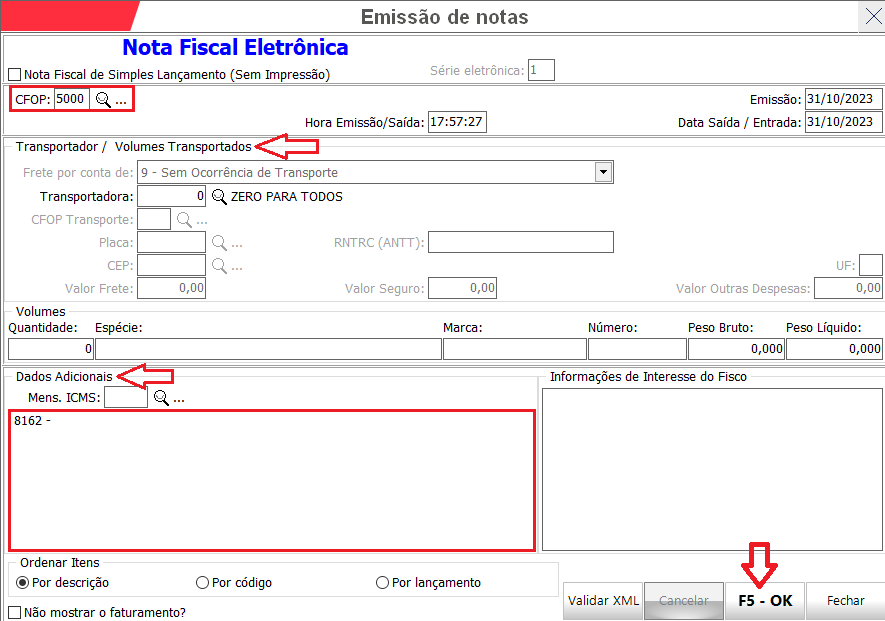 - Confirme o CFOP e verifique se há frete ou alguma informação adicional. Clique em OK para emitir a nota: