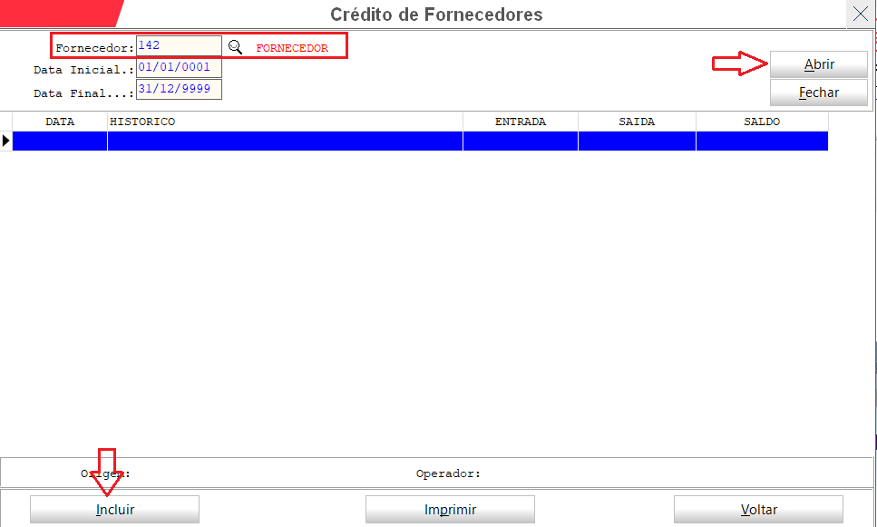 > Informe o Fornecedor e clique em Abrir. Será informado o histórico de crédito no fornecedor (entrada, saída e saldo final). Caso queira fazer algum lançamento, clique em Incluir: