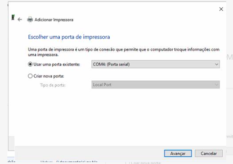 Escolha a porta da impressora (nesse exemplo é a COM4, confirme qual a porta no gerenciador de dispositivos do Windows)