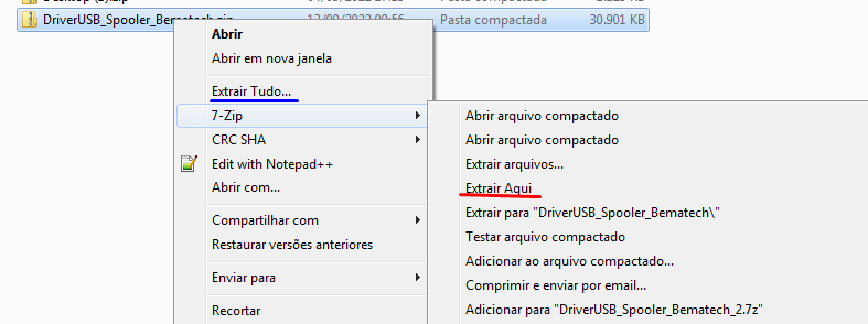 Após realizar o download da pasta DriverUSB_Spooler_Bematech, extraia a mesma. Pode utilizar tanto a opção Extrair Tudo, ou Extrair Aqui.