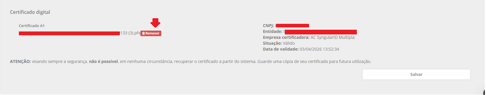 ao remover vai fica assim para poder importar o arquivo e digitar a senha do certificado
