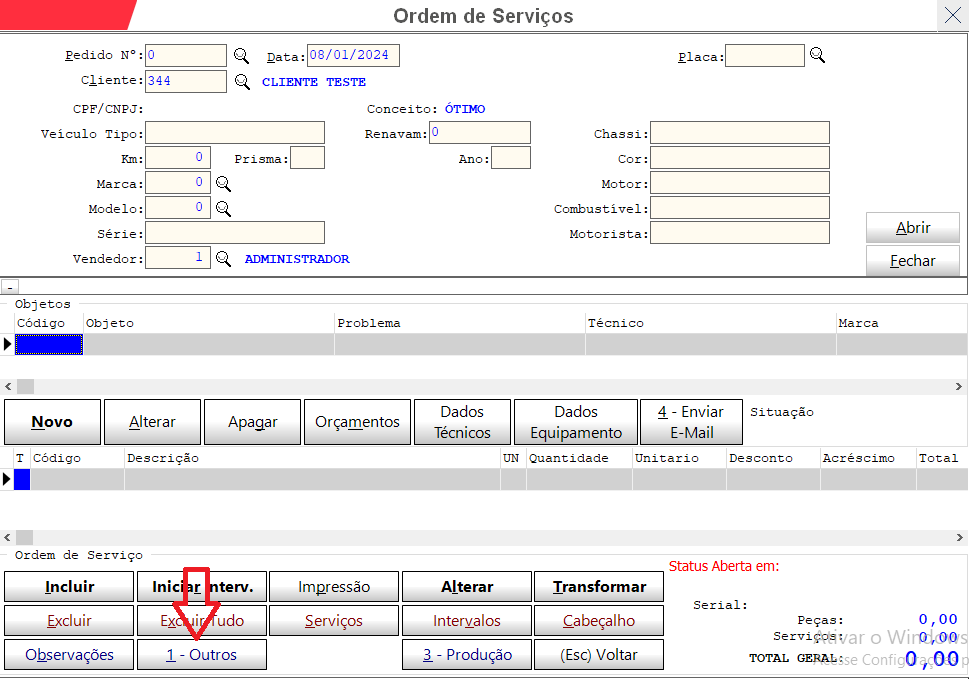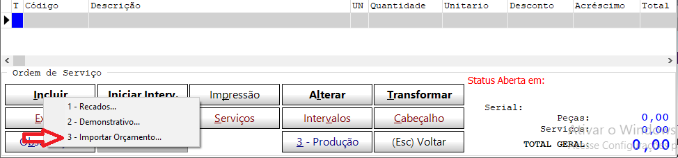 Após criar um orçamento, para transformá-lo em ordem de serviço é necessário abrir uma OS normalmente, com todas as informações do veículo, mas sem incluir as peças e serviços. Ao abrir a OS, seguir o caminho abaixo: