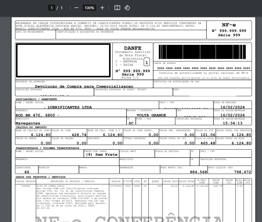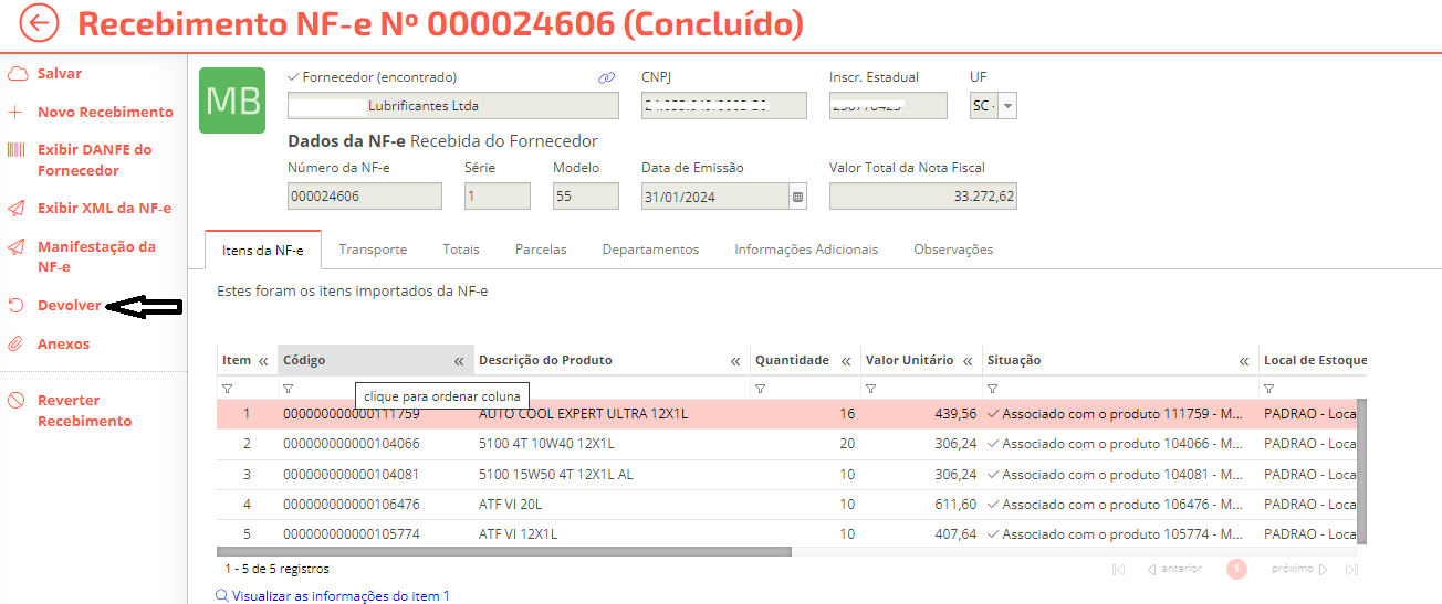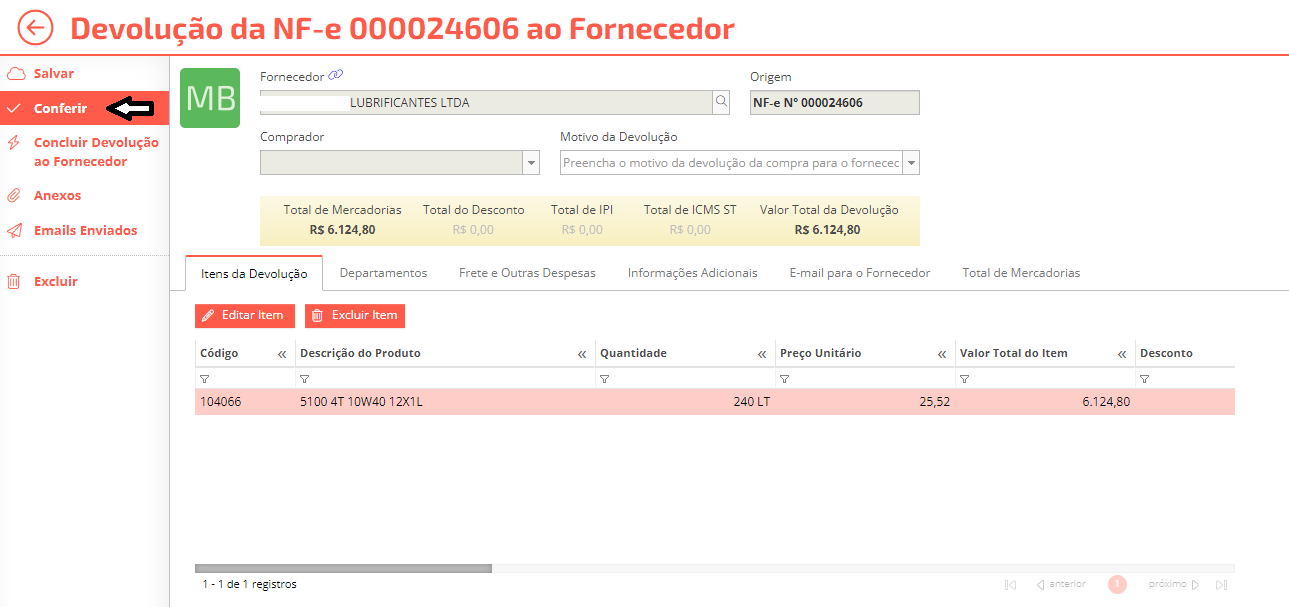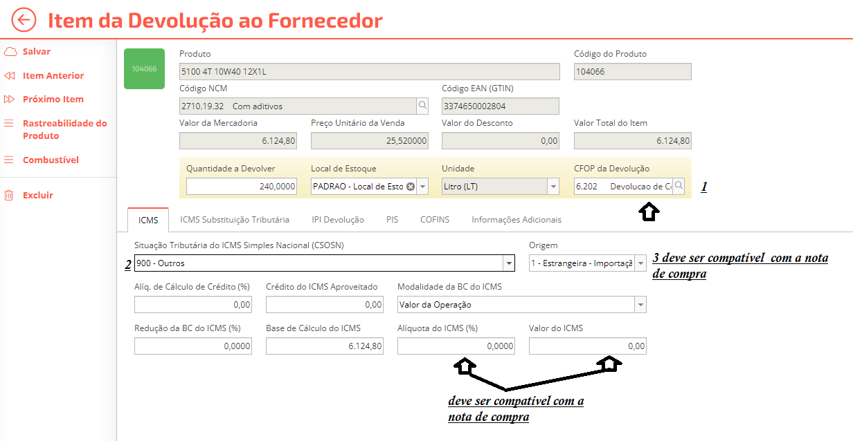 Após excluir os itens que não será devolvido, pode clicar em editar no item desejado para realizar os ajustes para destacar o ICMS