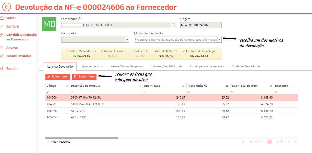 Agora será necessário remover os itens que não quer devolver se for o caso, e tambem realizar os ajustes necessário para devolver o ICMS.
