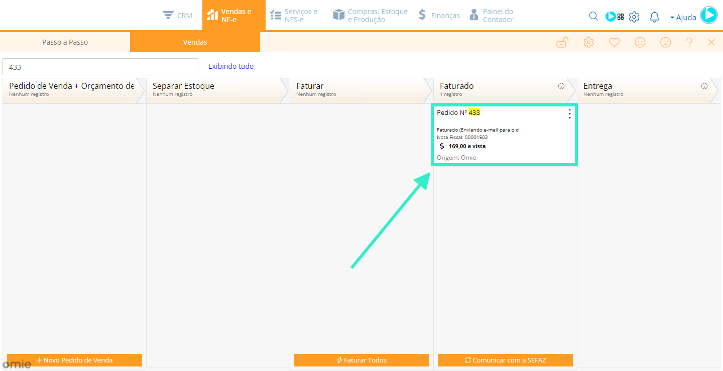 3) Nessa tela, apresentaremos um Kanban com seus Pedidos pendentes e faturados. Localize o Pedido Desejado e o acesse com um duplo clique: