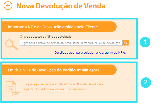 (1) Importar a NF-e de Devolução emitida pelo Cliente: Nos casos em que o cliente emite uma nota fiscal retornando as mercadorias, você pode digitar a chave de acesso ou realizar o upload do XML da nota;