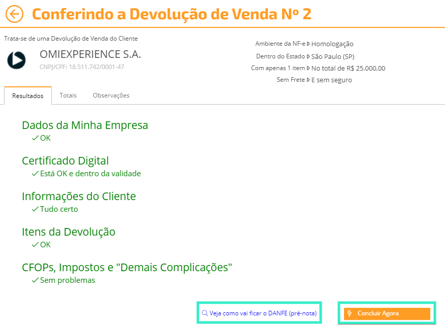 2) Você também pode gerar a pré-nota, basta clicar no botão "Veja como vai ficar o DANFE (pré-nota)" e, se tudo estiver correto, clique no botão "Concluir Agora":