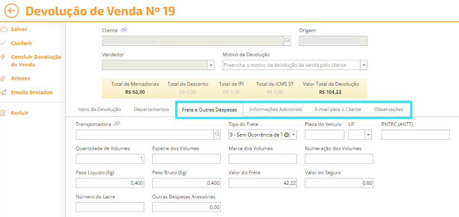 7) A devolução você também disponibiliza outras abas para preenchimento. Sendo elas:
