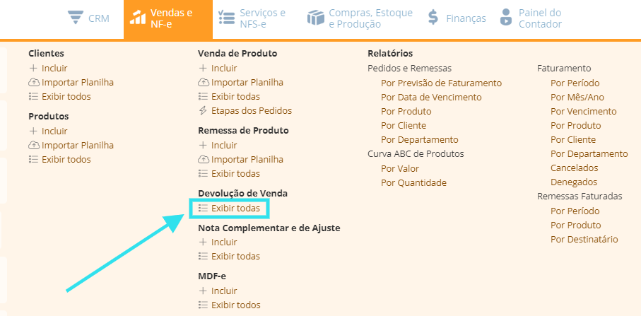 1) Acesse o Menu Suspendo do módulo de Vendas e NF-e, e clique em "Exibir todas" no grupo Devolução de Venda: