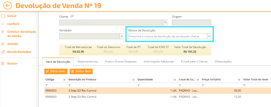 1) Na tela de Devolução de Venda, localize o campo "Motivo da Devolução".