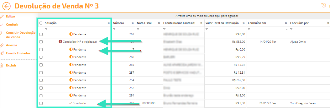 Na coluna "Situação", o Omie demonstrará o status da emissão da NF-e de Devolução: