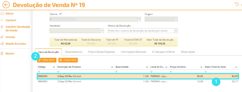 4) Caso você precise editar as quantidades a serem devolvidas, selecione o item de interesse (1) e clique em "Editar Item" (2):