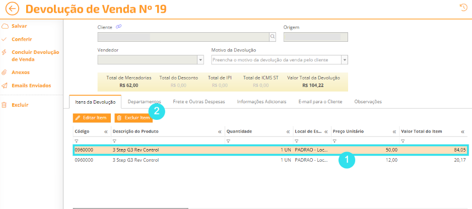 Caso você não queira devolver algum item, o selecione (1) e posteriormente clique em "Excluir Item" (2):
