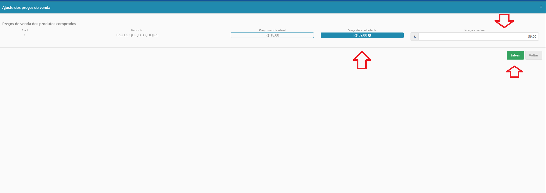 confira o preço sugerido ou ajuste para o valor de venda desejado e clica em salvar para finalizar o processo de entrada.