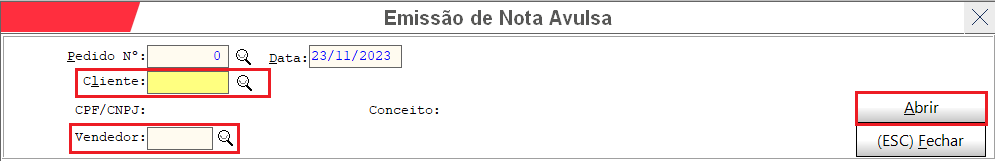 Irá abrir esta tela e é só apertar enter que irá pular do campo pedido para data e depois para campo cliente. Informe o Cliente e confirme o Vendedor, depois clique em Abrir: