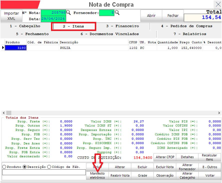 Ao entrar com a nota fiscal de compra, ainda na aba 2-Itens, clique em Manifesto Eletrônico: