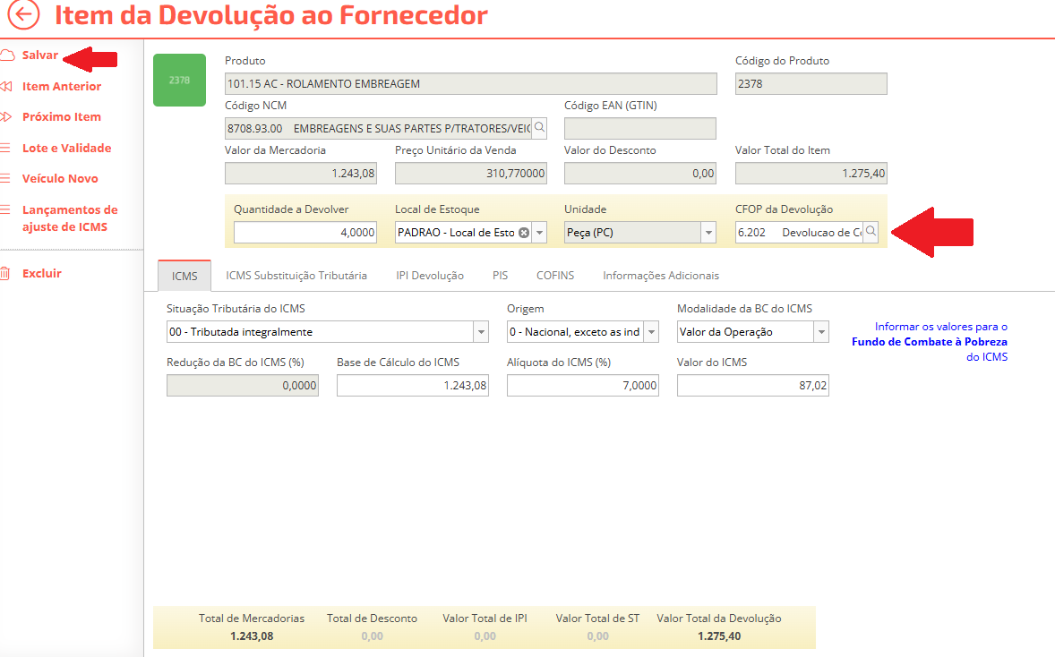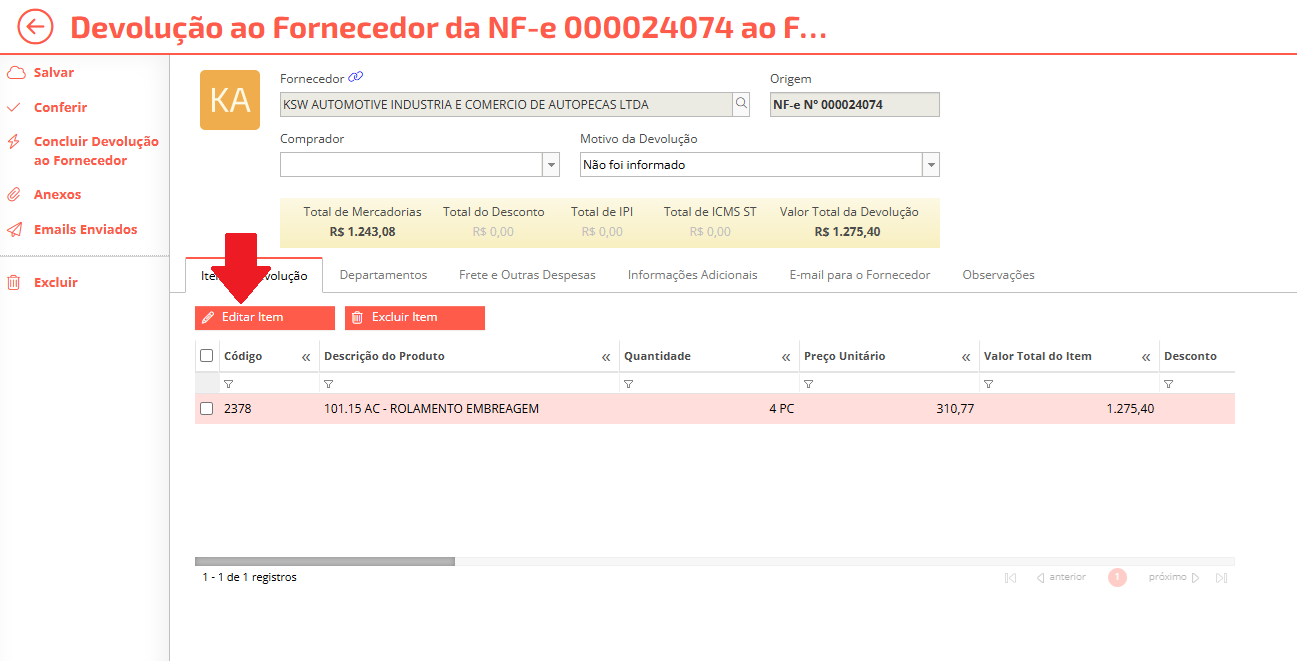 clique em editar item para inserir o CFOP de devolução, caso tenha mais itens na devolução o sistema pode perguntar se quer replicar para todos os itens da devolução.