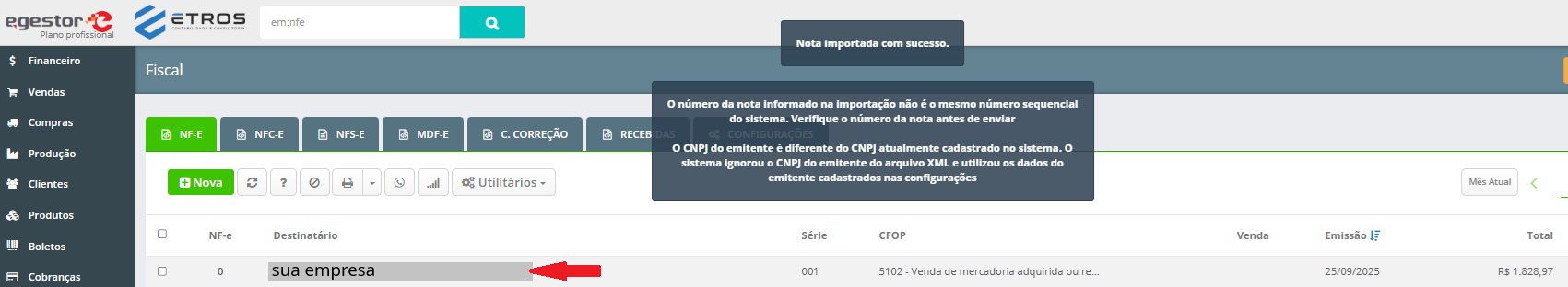 A nota vai aparece com o nome da sua empresa, clica nela para abrir e iniciarmos a refificação dos dados