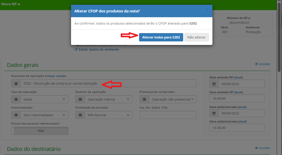 quando alterar o CFOP no cabeçalho, o sistema irá perguntar se deseja laterar nos produtos tambem e você vai clicar em alterar.