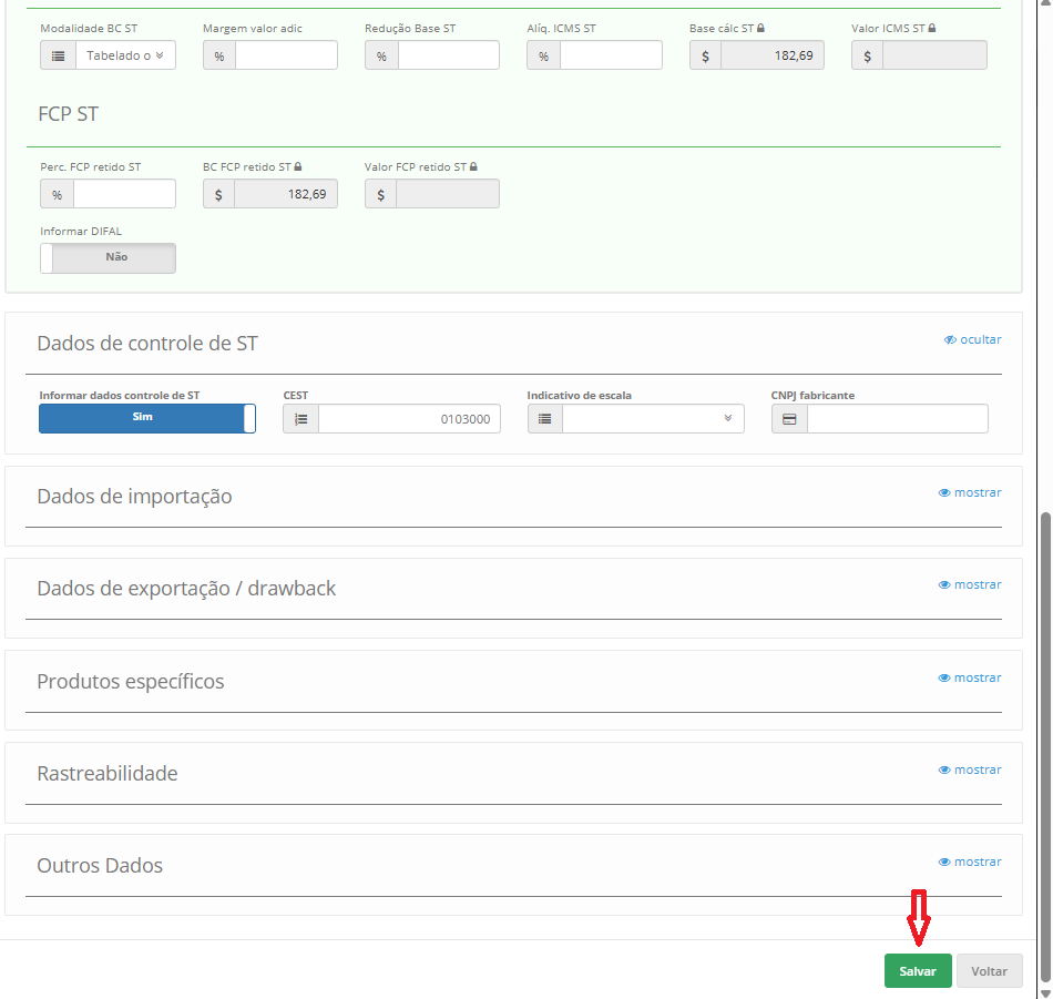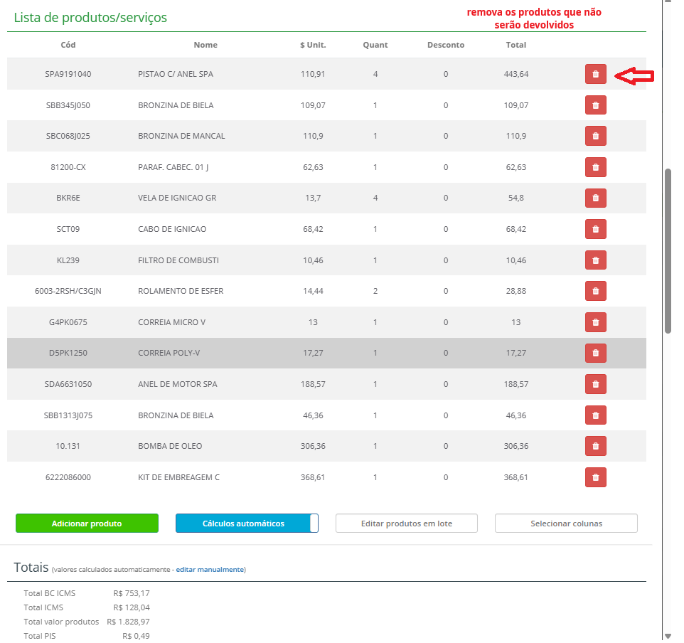 Ao rolar a pagina para baixo verá todos os produtos que poderão ser removidos ou editados caso seja preciso, como no caso da CST para destacar o ICMS que seu fornecedor irá precisa.