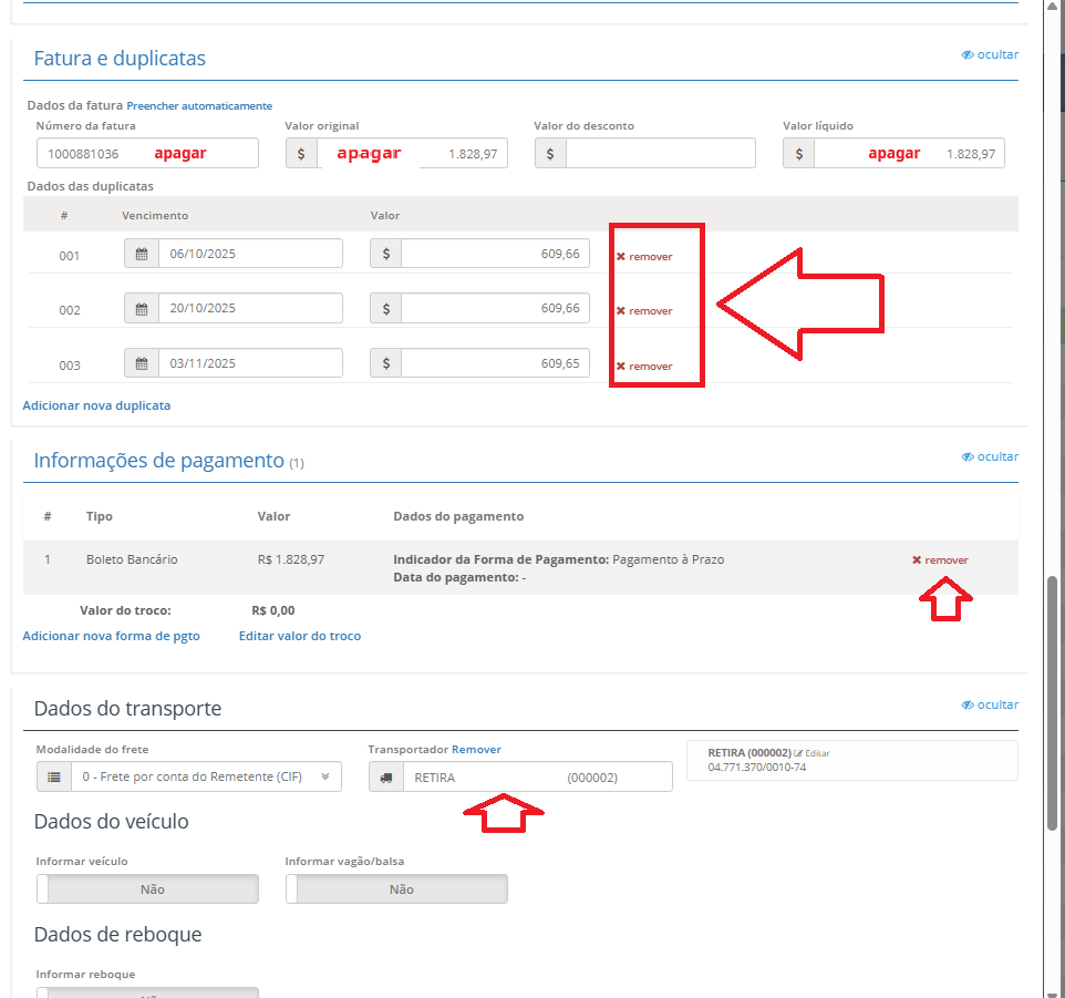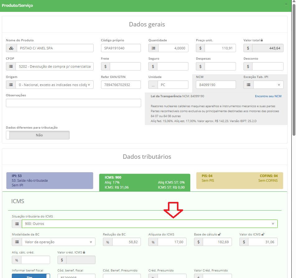 Apos editar o produto iremos conferir as outras informações da nota que devemos remover por ter vindo da importação e não iremos precisar, veja a seguir.